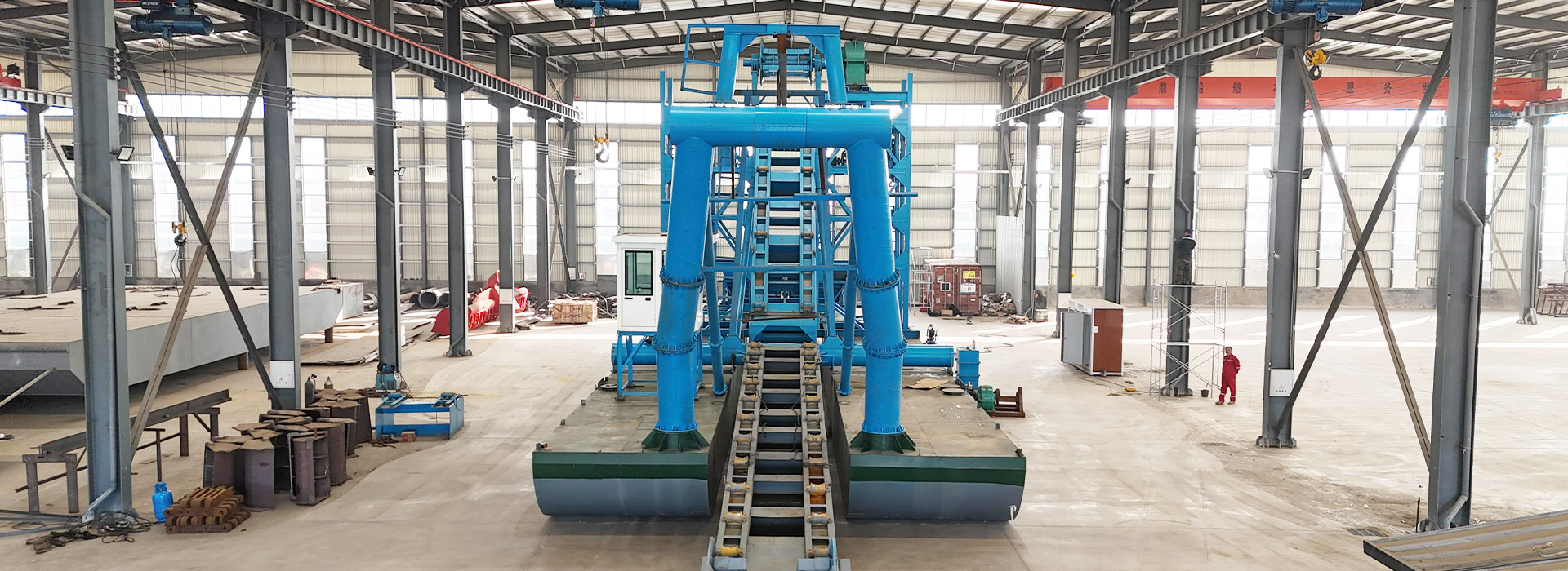 2、采用模塊化拼裝船體,泵船船體工廠分體制作,然后由陸路運輸至施工現場,在平整的地面拼裝后 下水或者將船體吊至水上拼裝。